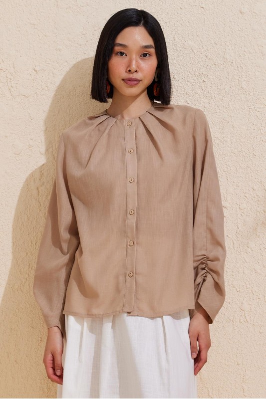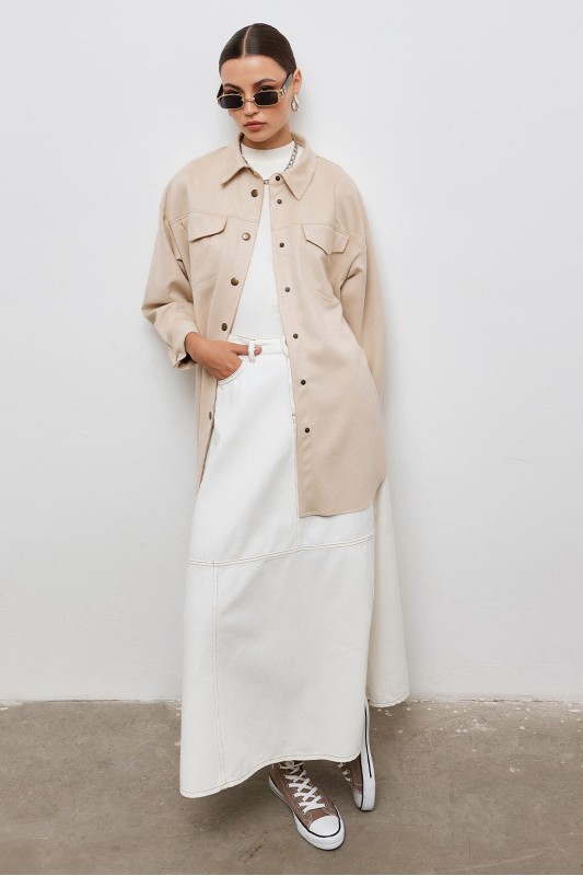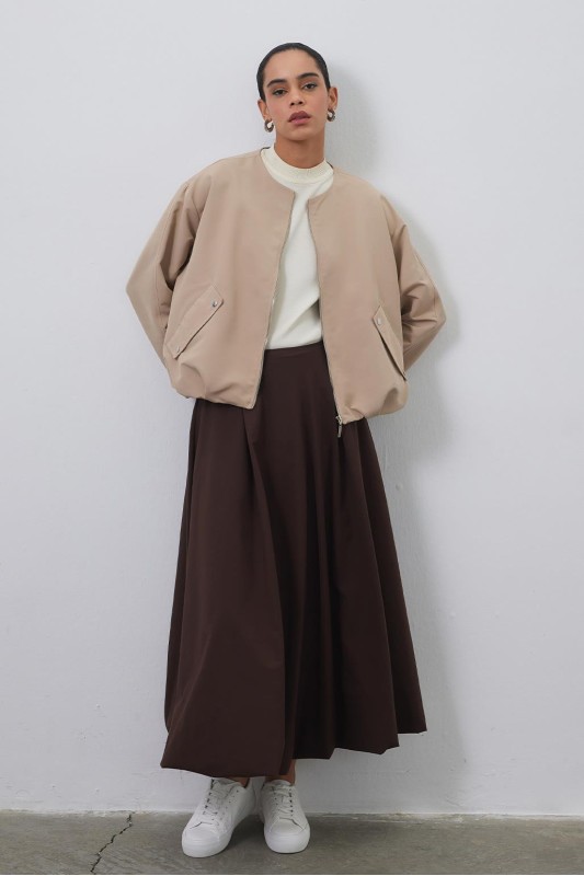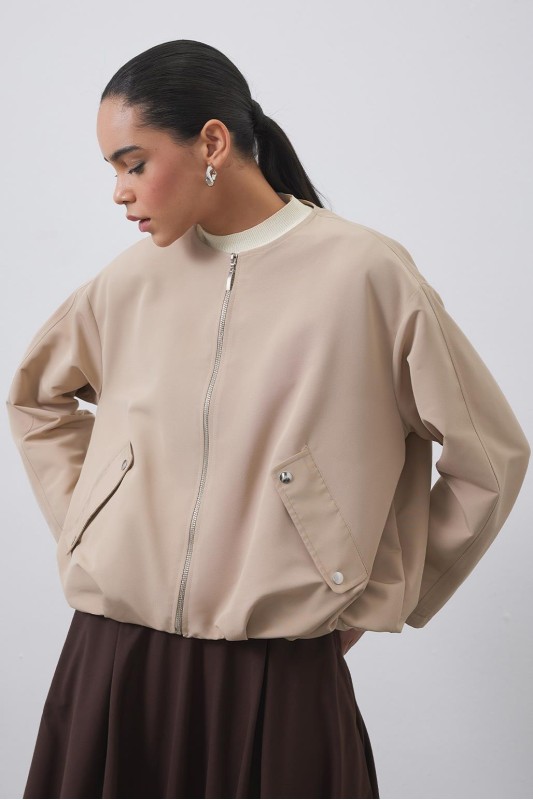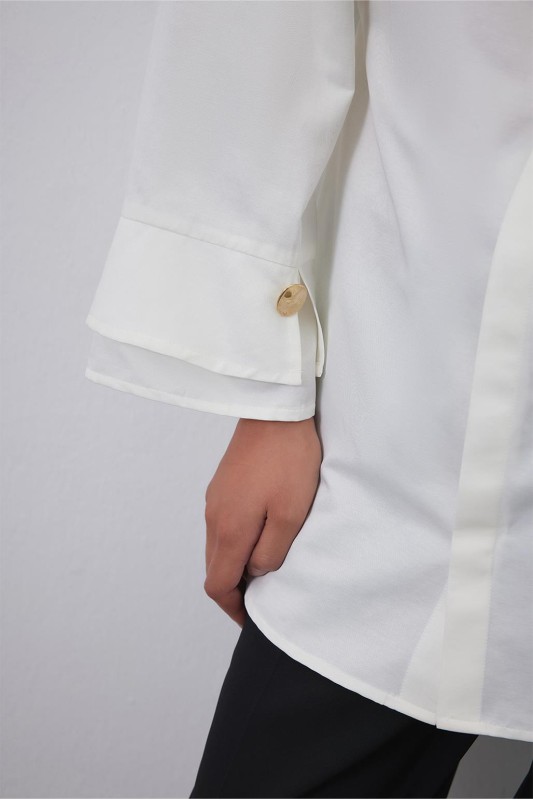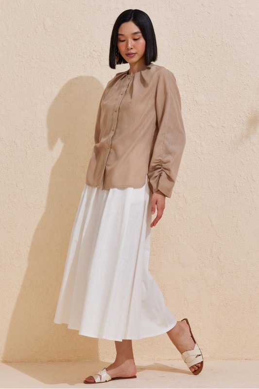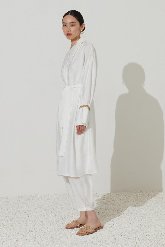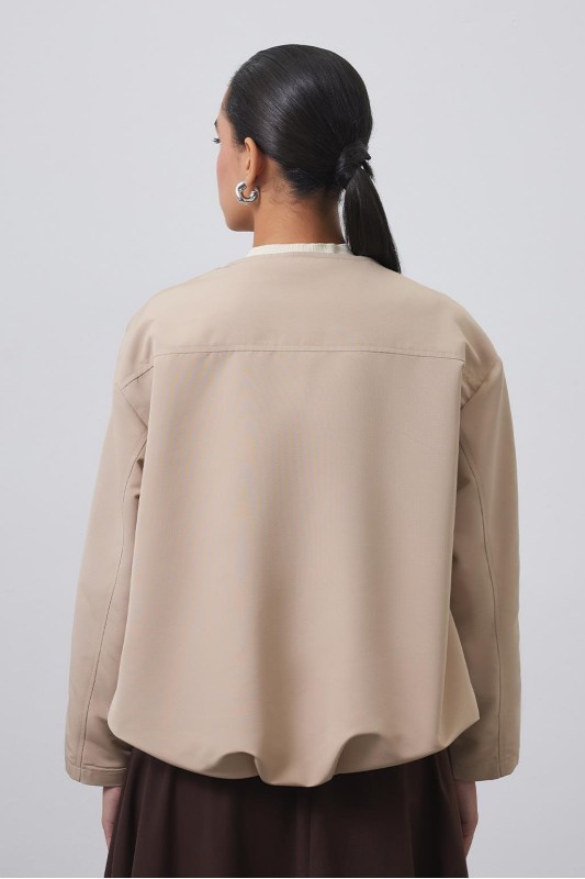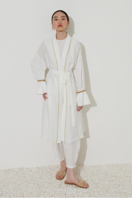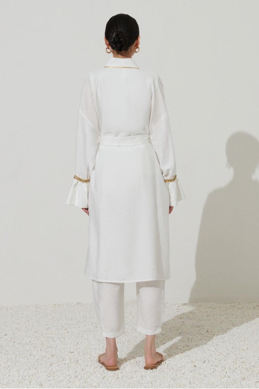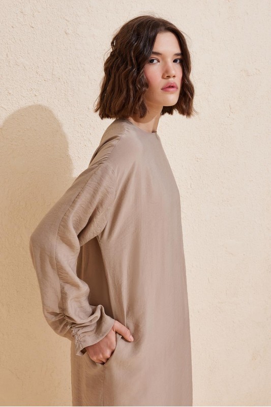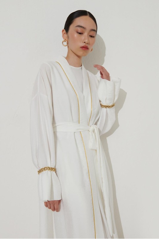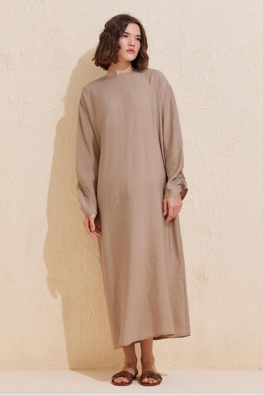 Kol Büzgülü Gold Detay Kap Abaya Ekru