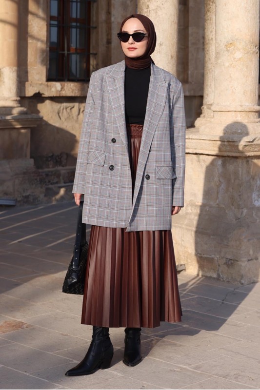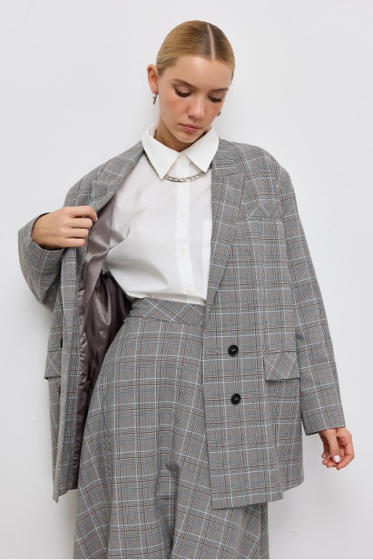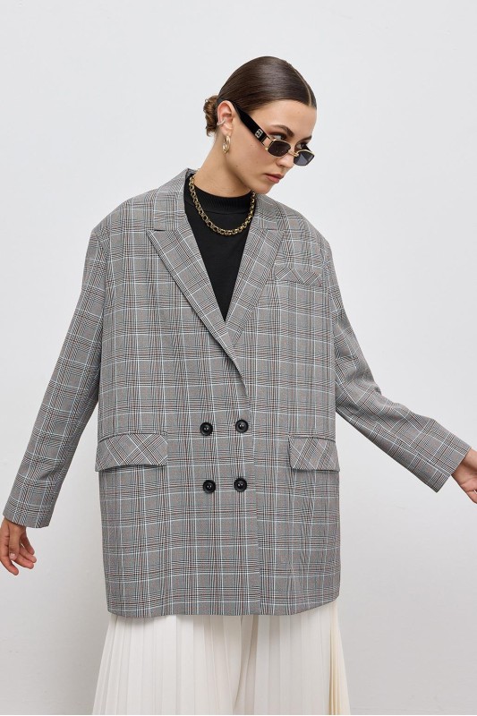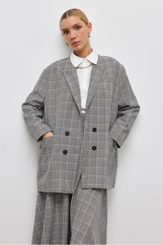 Kruvaze Oversıze Desenli Ceket Gri