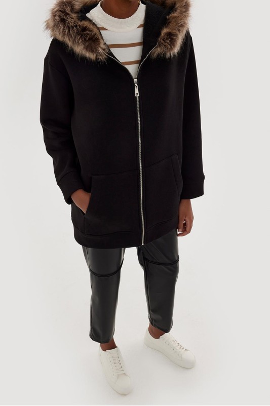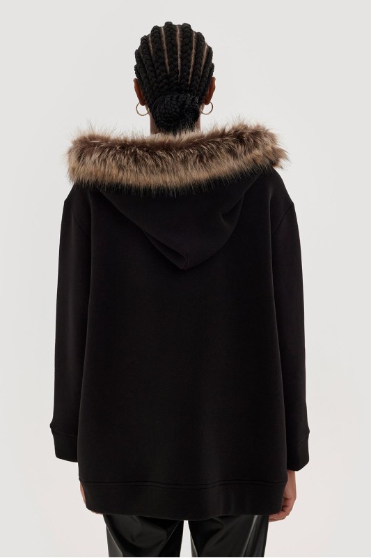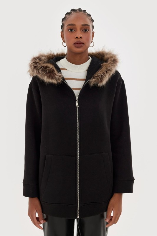 Kürklü Kapüşonlu Hırka Siyah