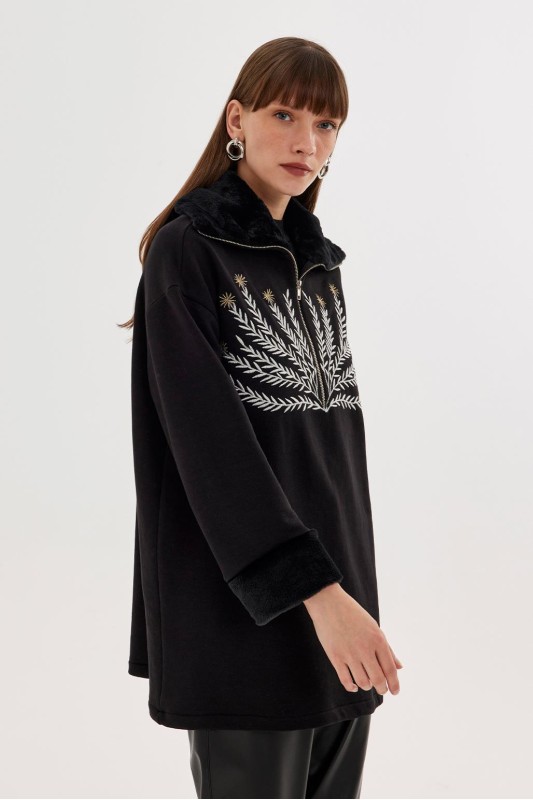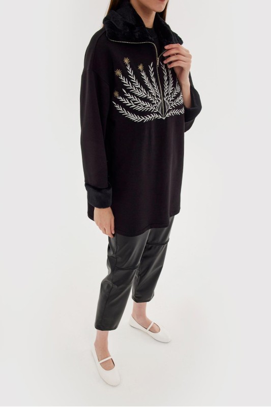 Kürklü Nakış İşlemeli Sweatshirt Siyah