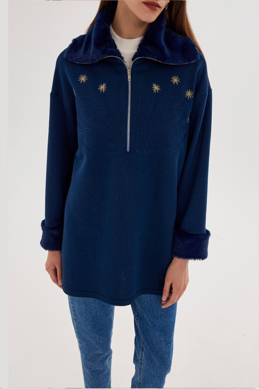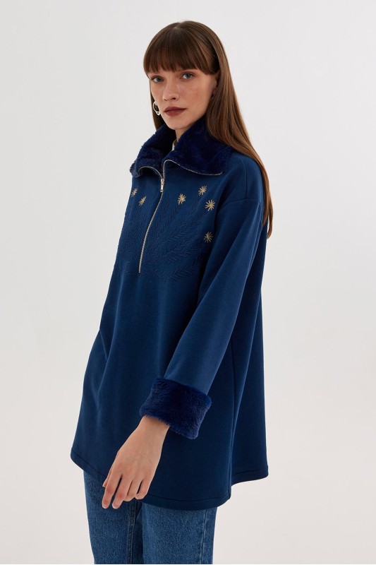 Kürklü Nakış İşlemeli Sweatshirt İndigo