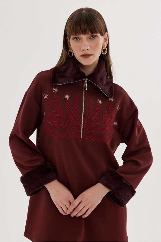 Kürklü Nakış İşlemeli Sweatshirt Vişne