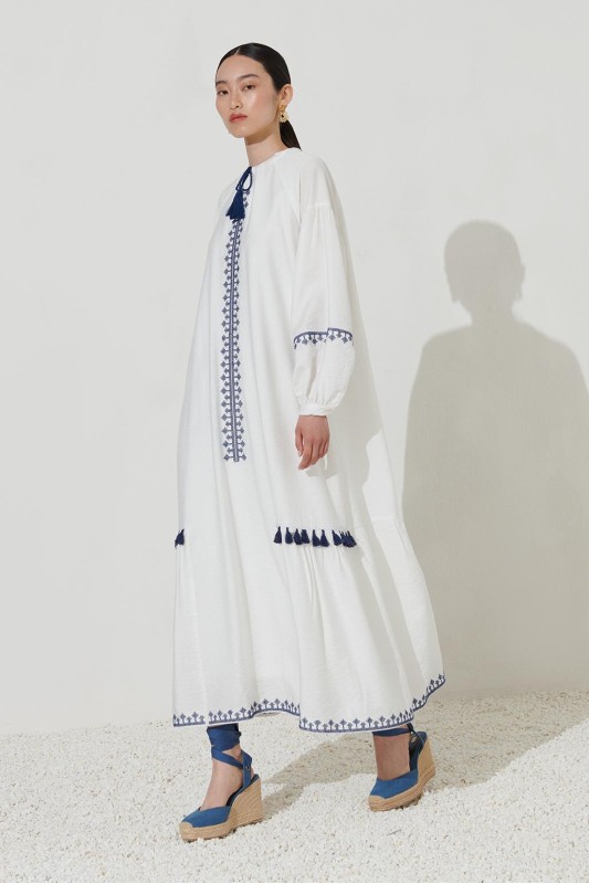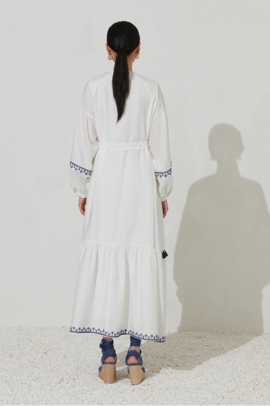 Nakış Püskül Detaylı Elbise Ekru