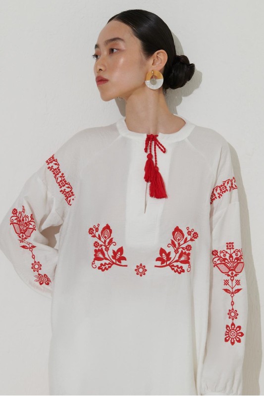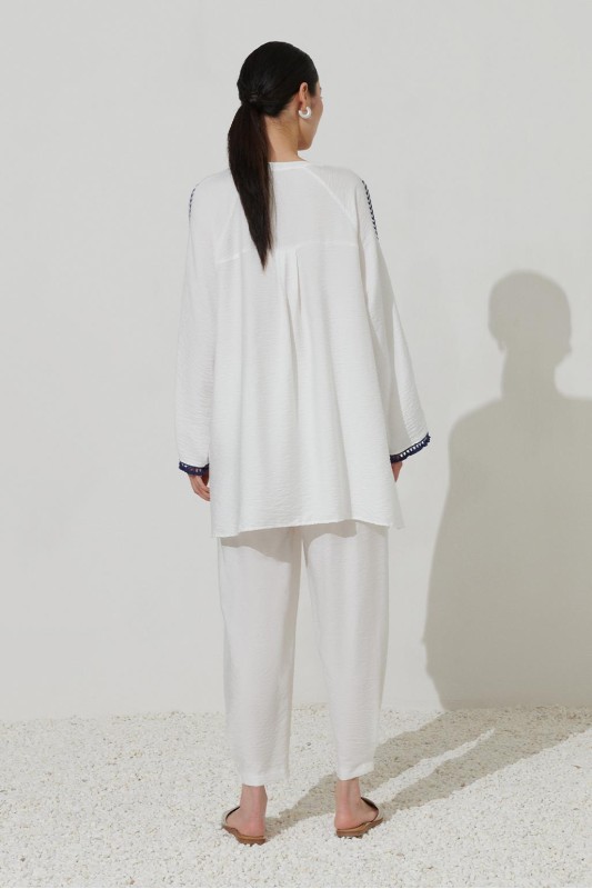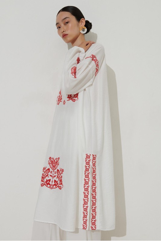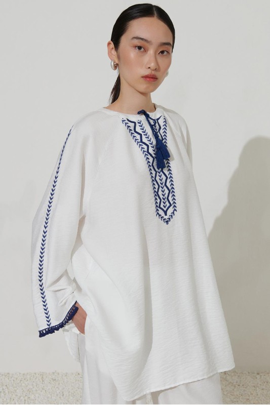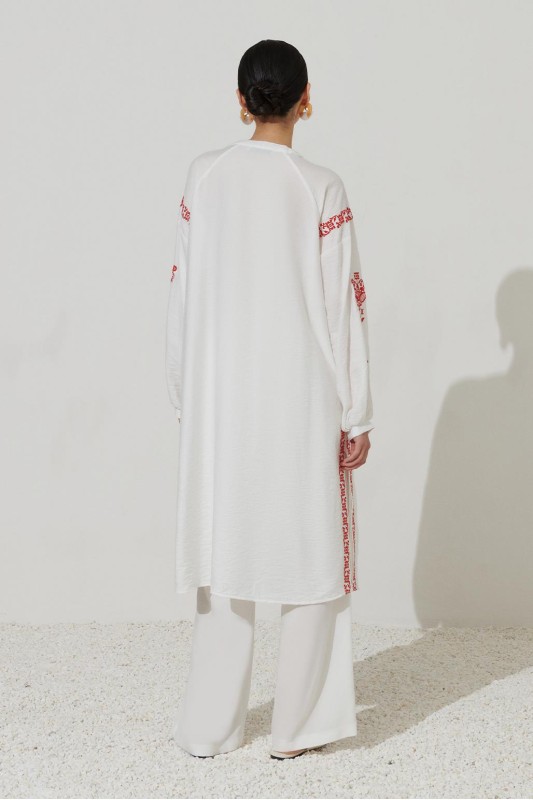 Nakış Detaylı Yırtmaçlı Keten Tunik Ekru