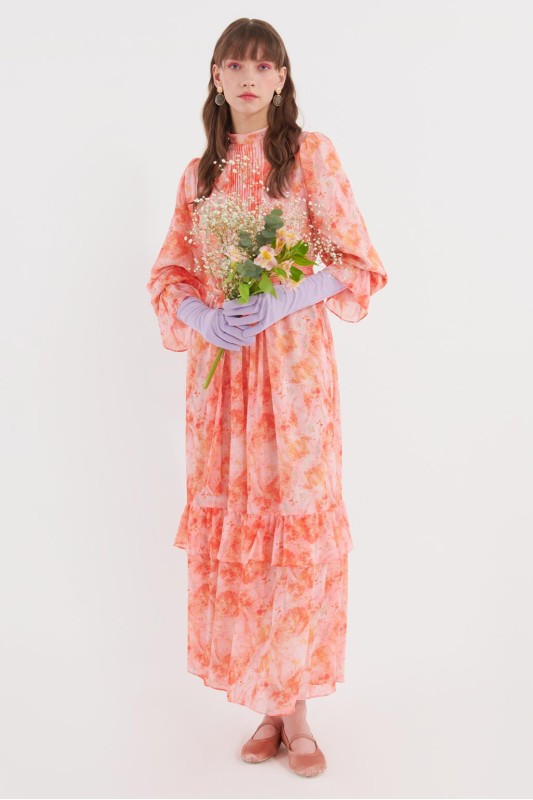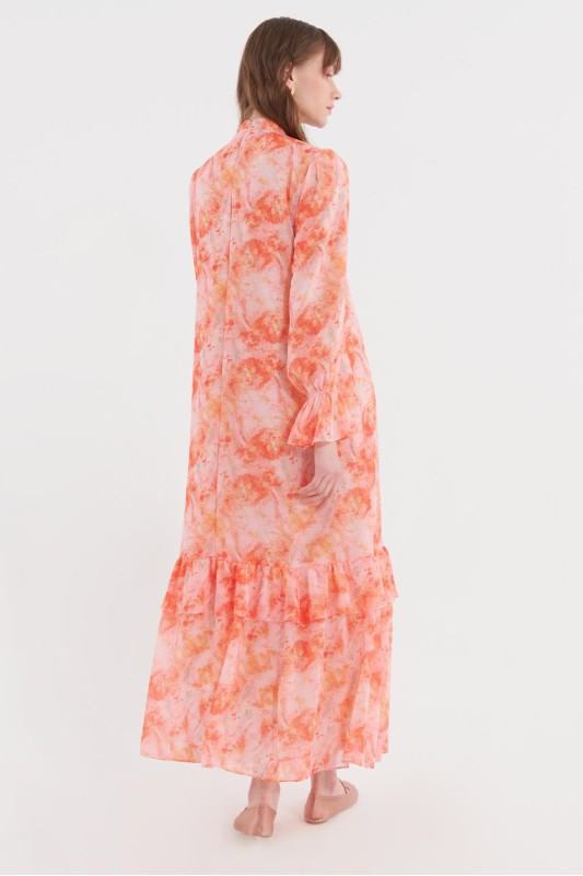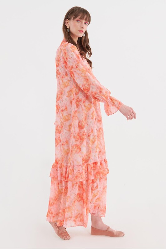 Nervürlü Fırfırlı Kol Desenli Şifon Elbise Somon