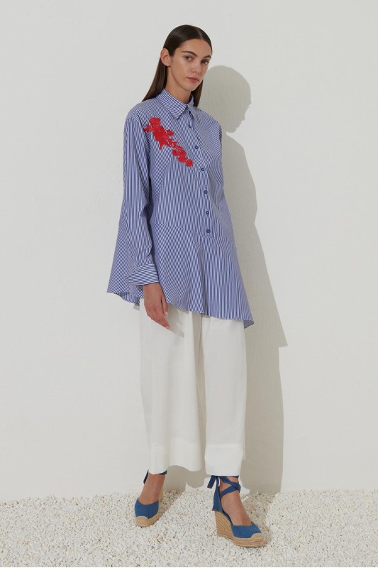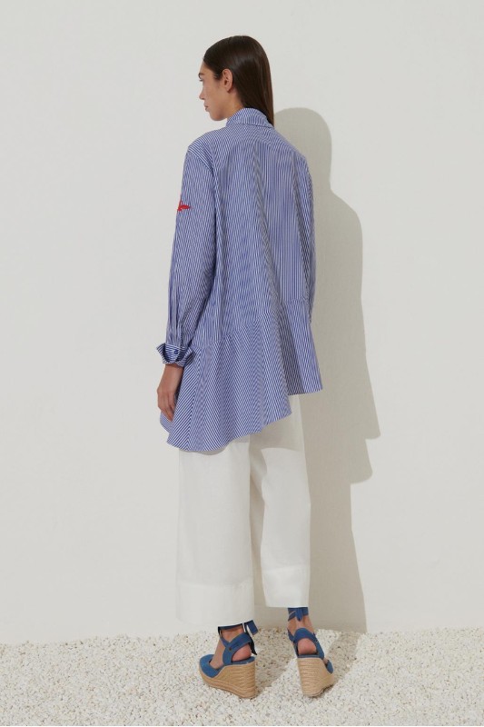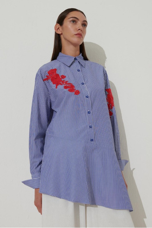 Nakışlı Volanlı Çizgili Gömlek Mavi