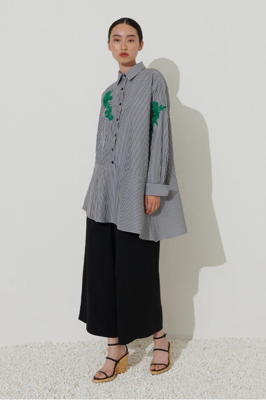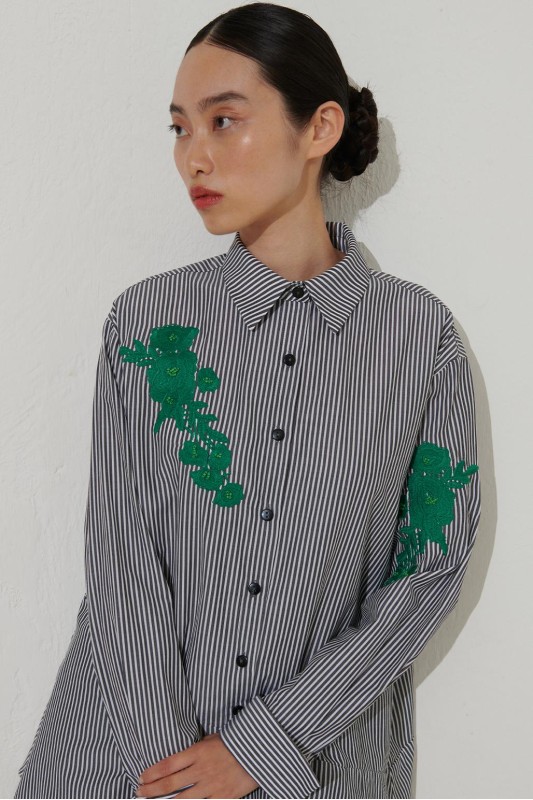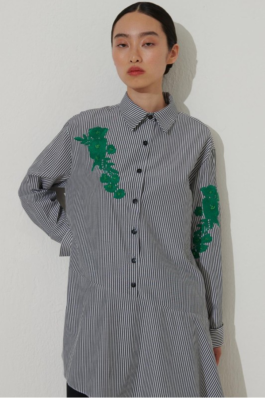 Nakışlı Volanlı Çizgili Gömlek Siyah