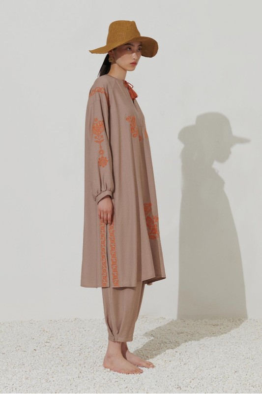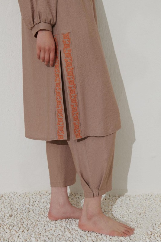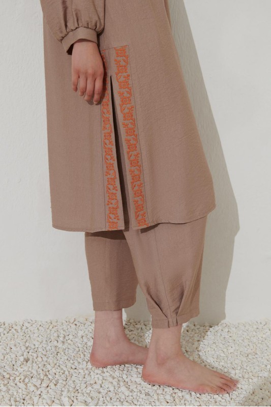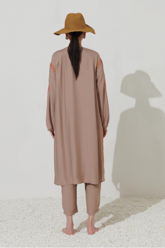 Nakış Detaylı Yırtmaçlı Keten Tunik Vizon