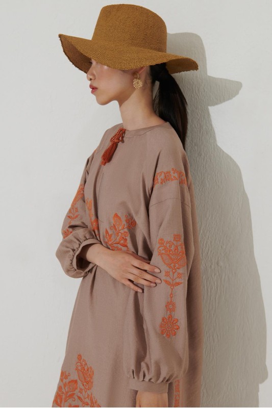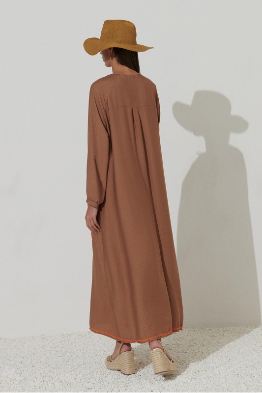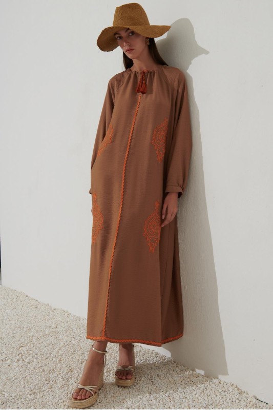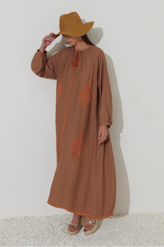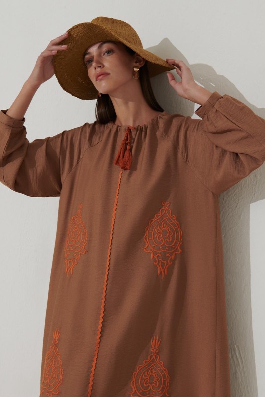 Nakışlı Kol Detaylı Keten Elbise Camel