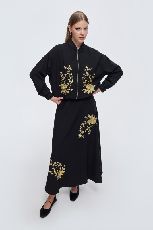 Nakış Detay Bomber Ceket-Etek Takım Siyah