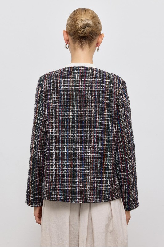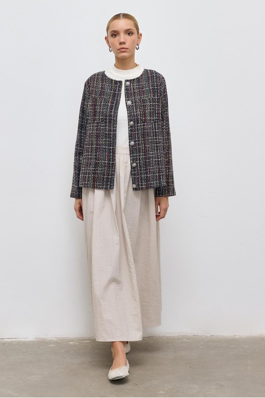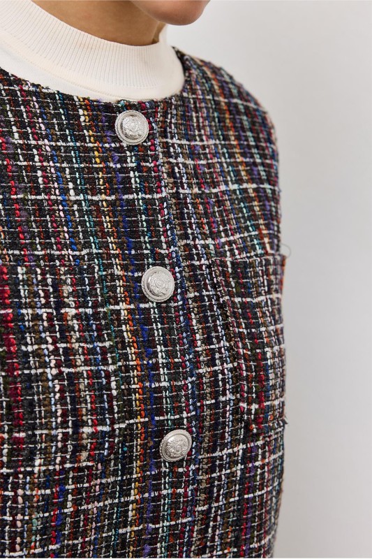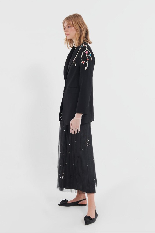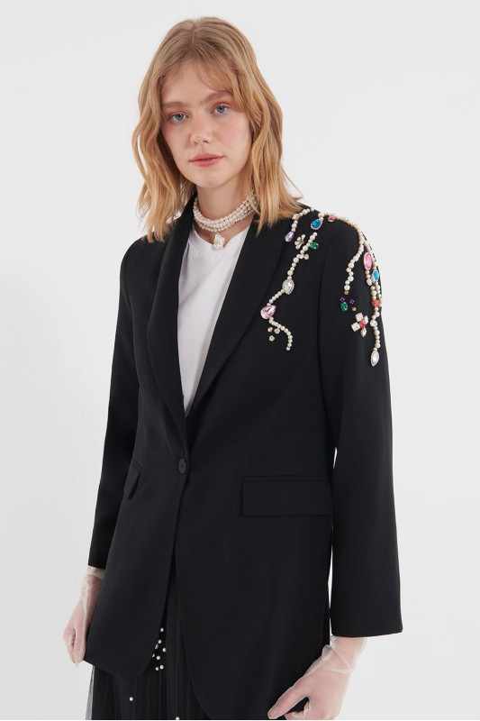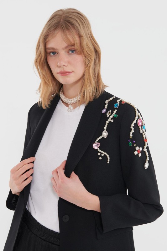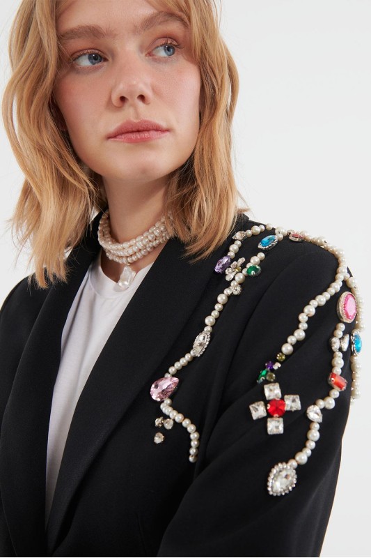 Renkli İnci Damla Taş İşleme Detaylı Düğmeli Ceket Siyah