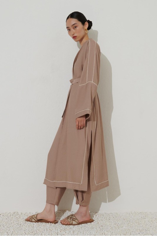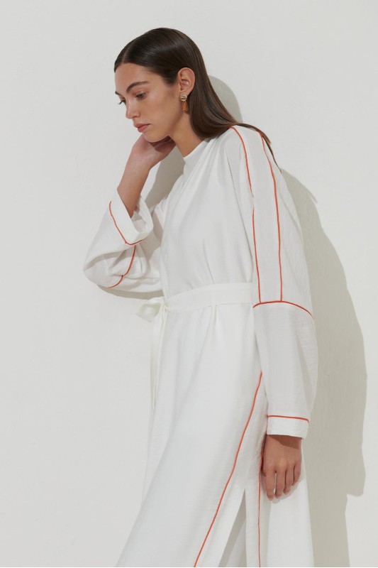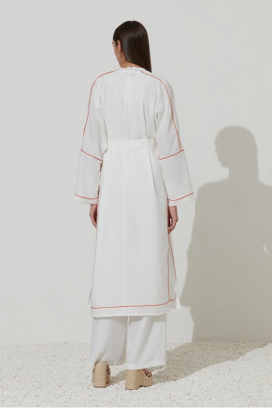 Renkli Biyeli Keten Abaya Ekru