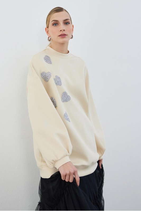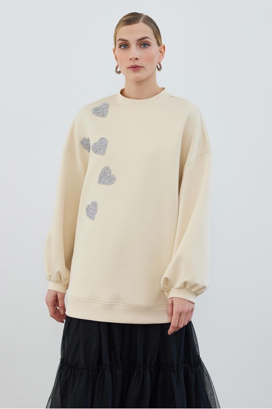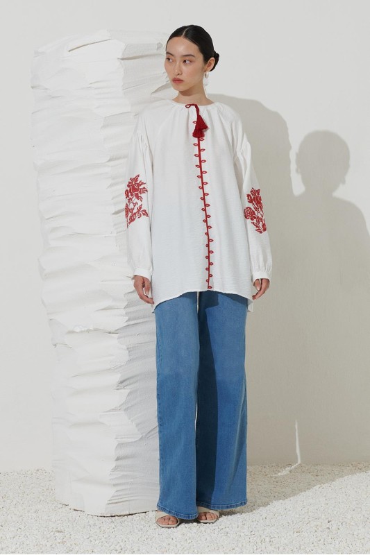Reglan Kol Nakış Detaylı Keten Tunik Ekru