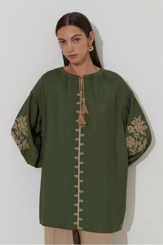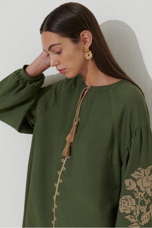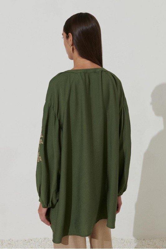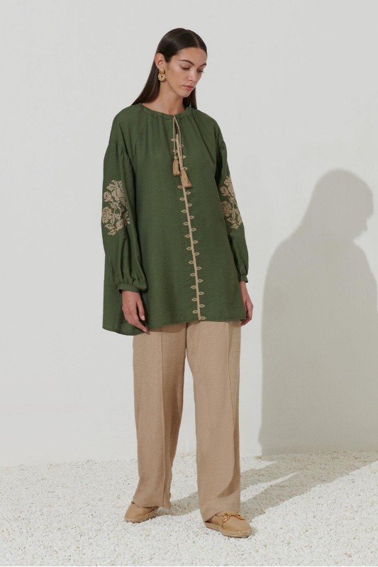 Reglan Kol Nakış Detaylı Keten Tunik Haki Yeşil