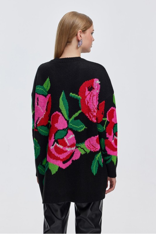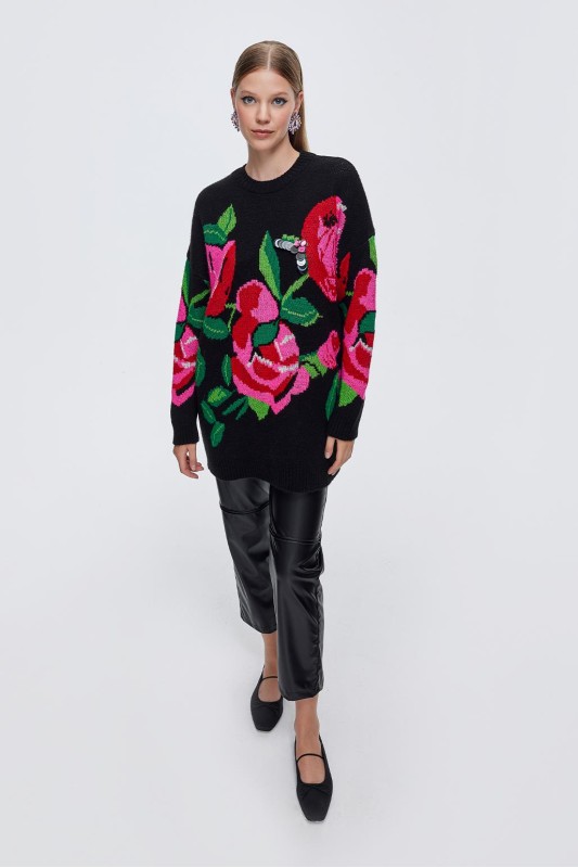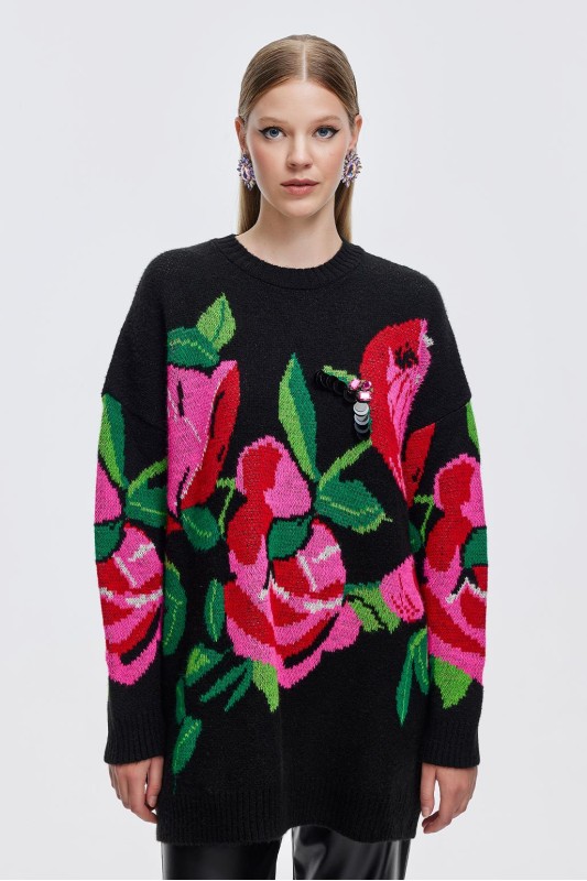 Rose İşlemeli Triko Kazak Desenli