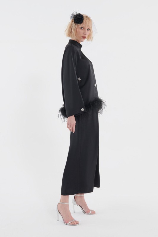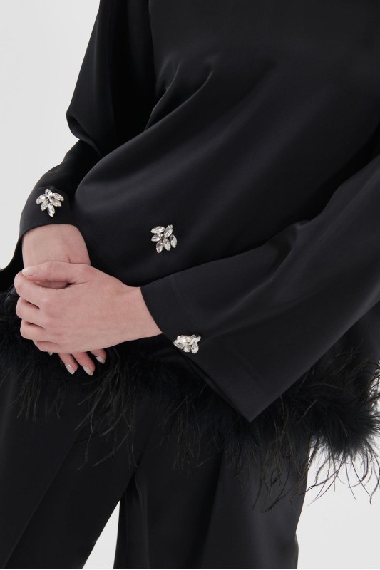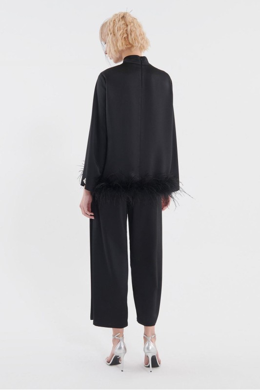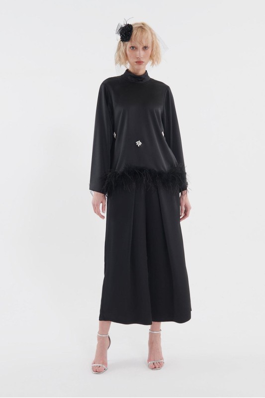 Tüylü İşlemeli Bluz Pileli Pantolon Takım Siyah