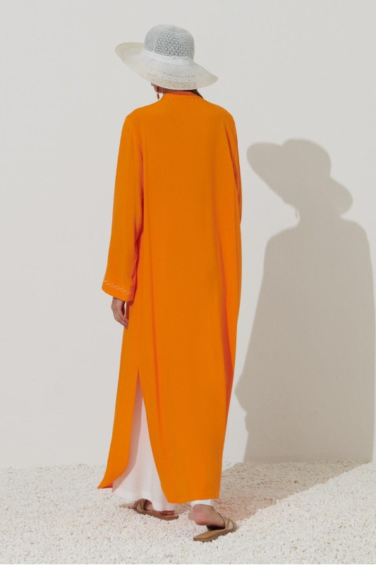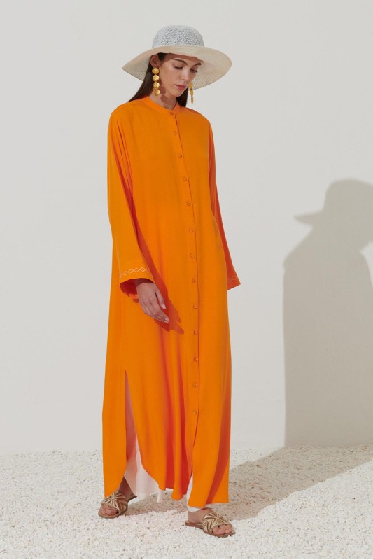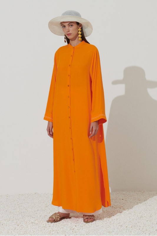 Uzun Nakışlı Gömlek Elbise Turuncu