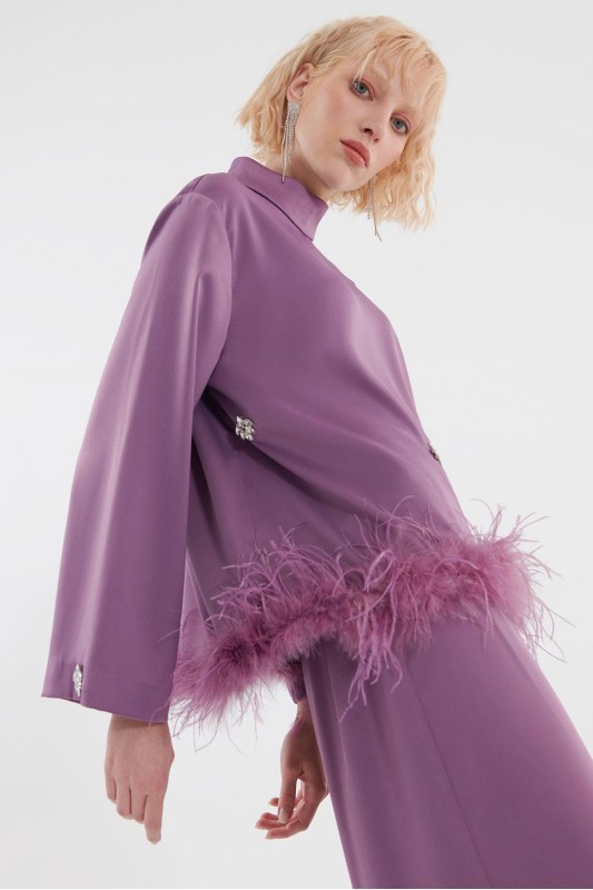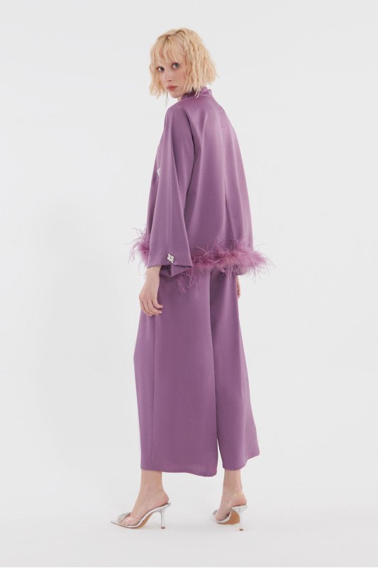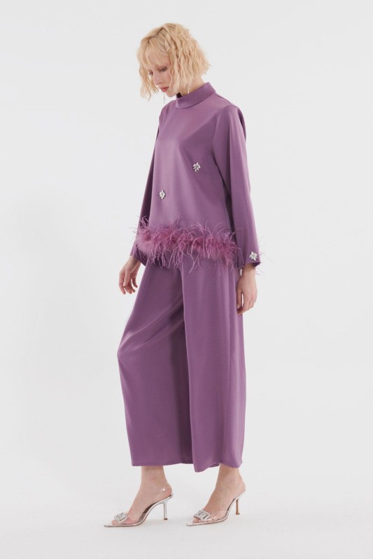 Tüylü İşlemeli Bluz Pileli Pantolon Takım Lavanta