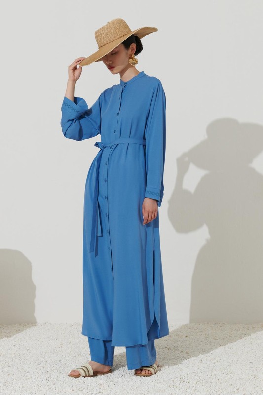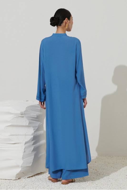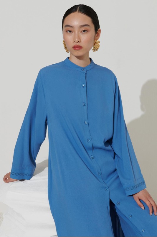 Uzun Nakışlı Gömlek Elbise Kot Mavi