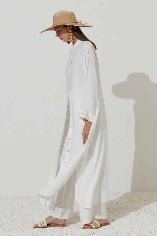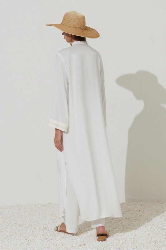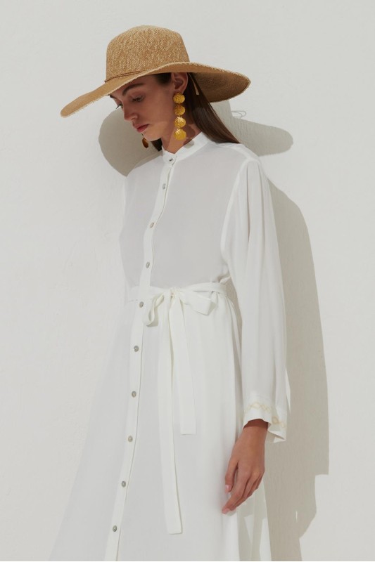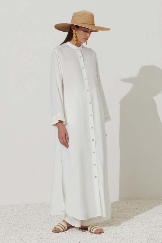 Uzun Nakışlı Gömlek Elbise Ekru