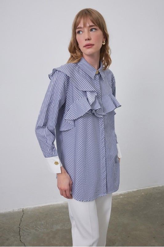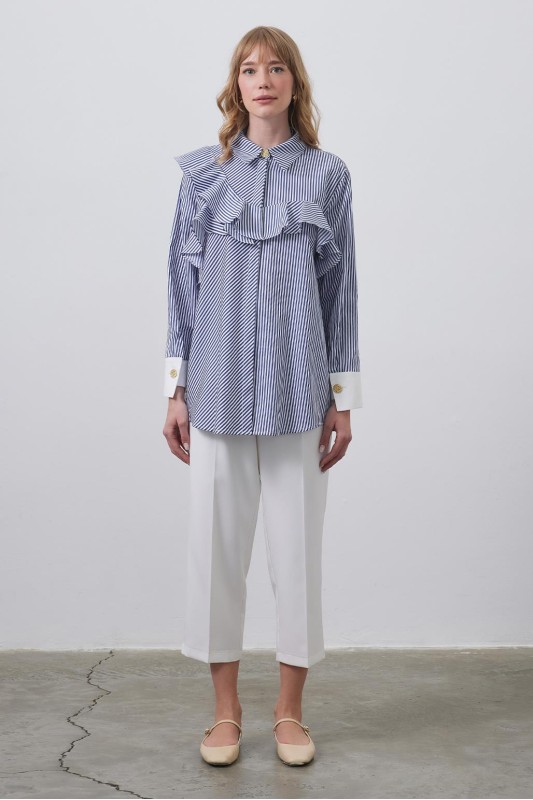 Volanlı Manşet Detaylı Gömlek Lacivert