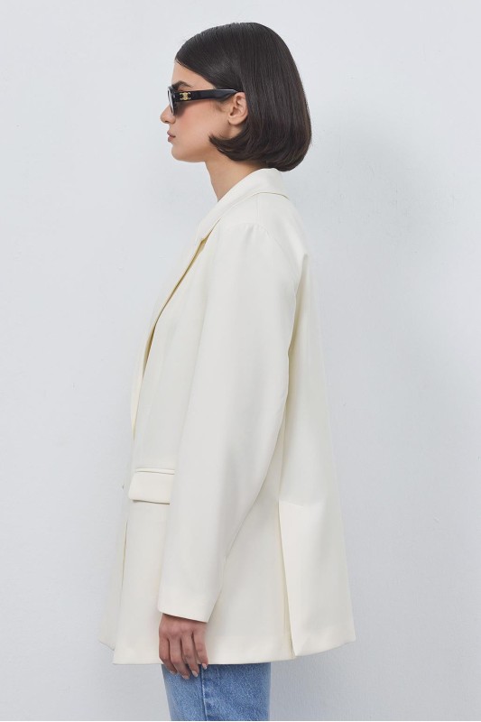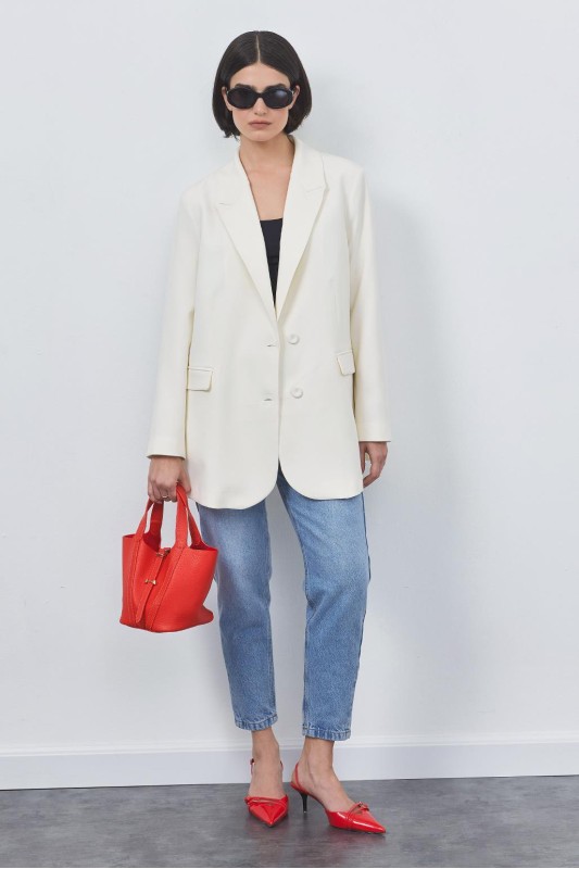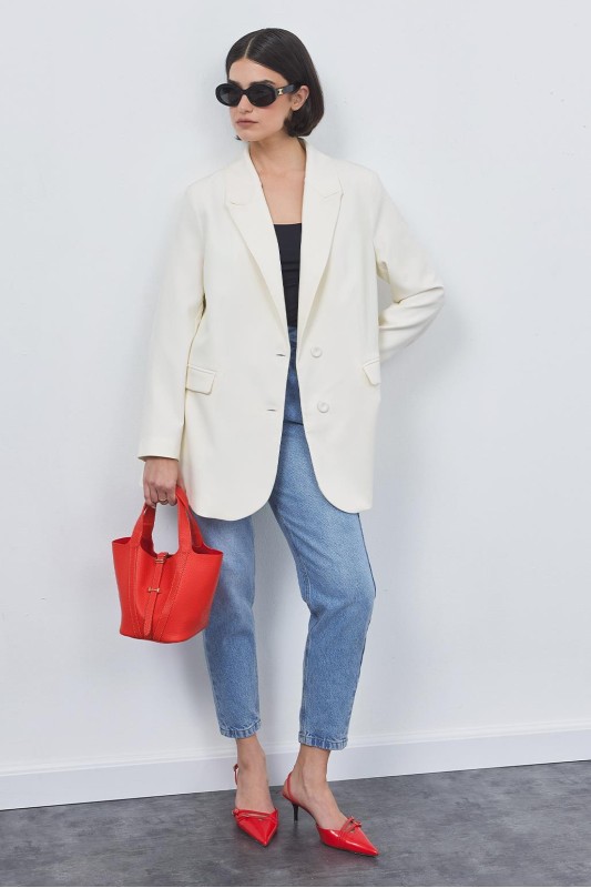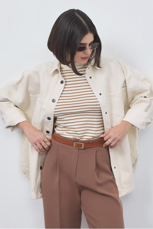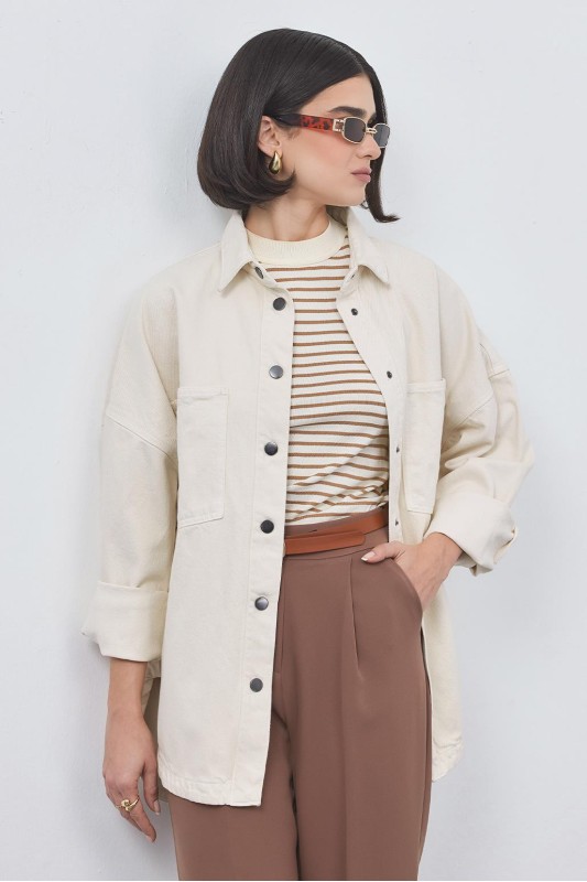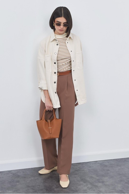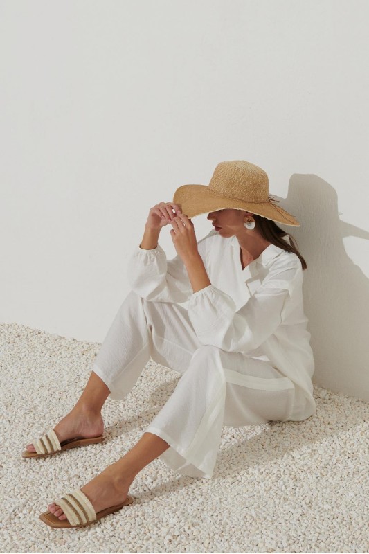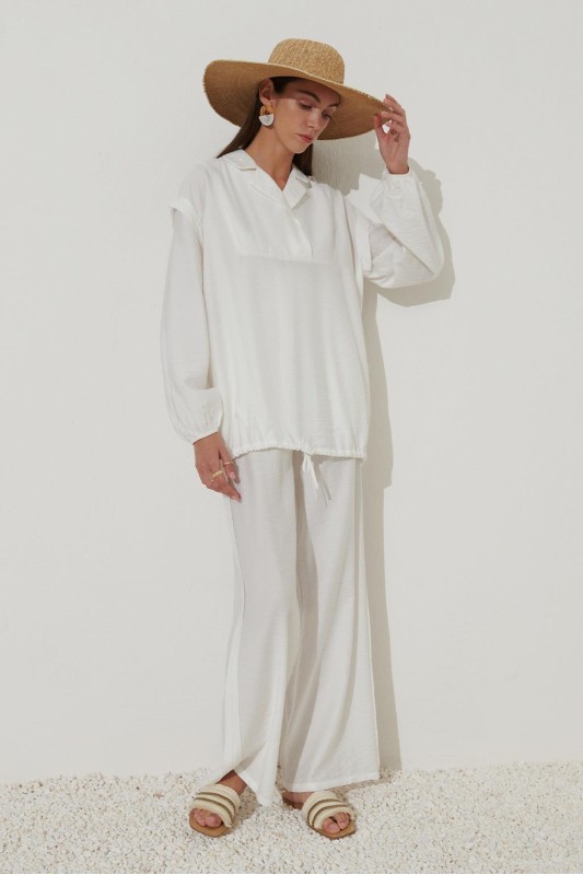 Yaka Detaylı Keten Gömlek Pantolon Takım Ekru