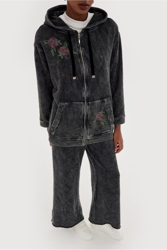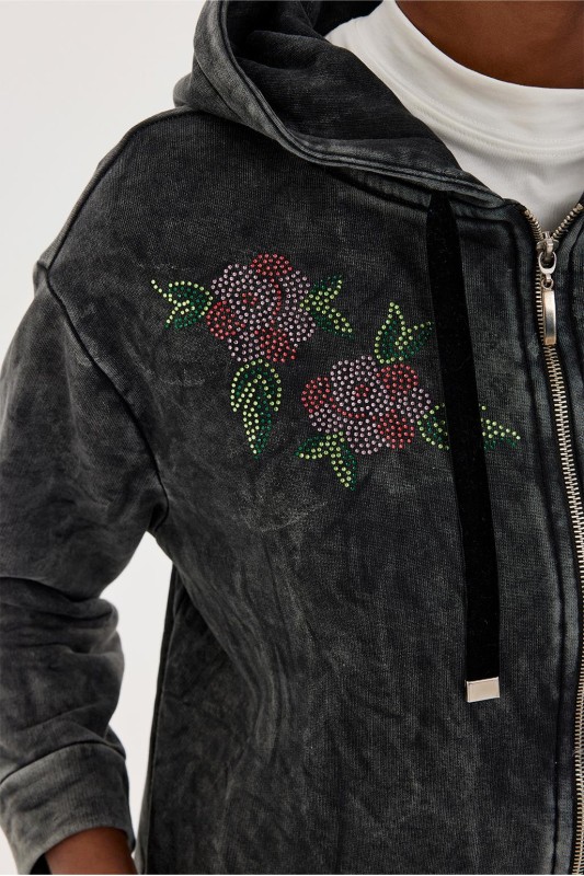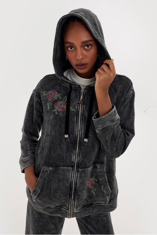 Yıkamalı Taş İşleme Kapüşonlu Hırka Gri