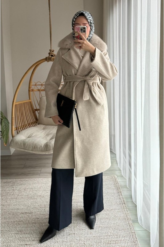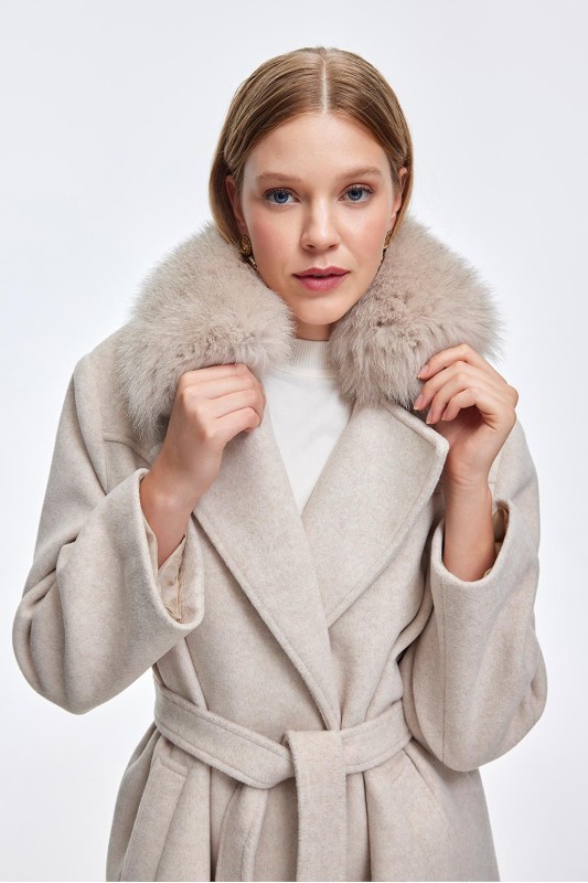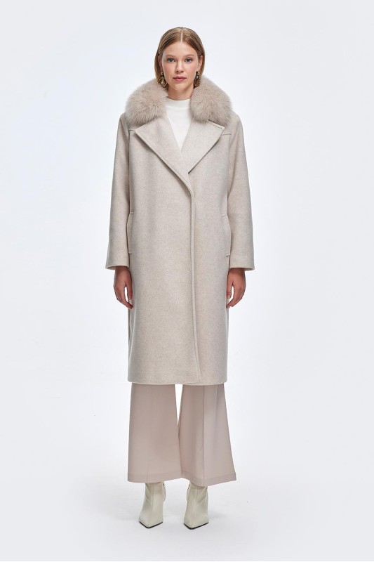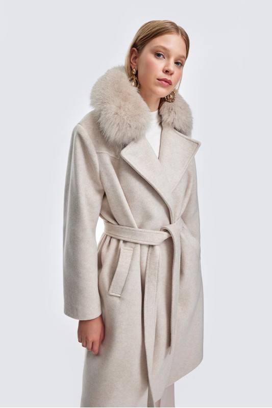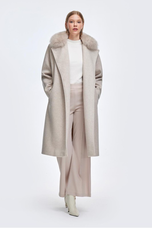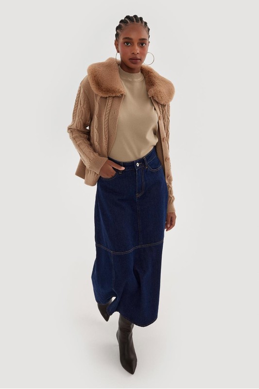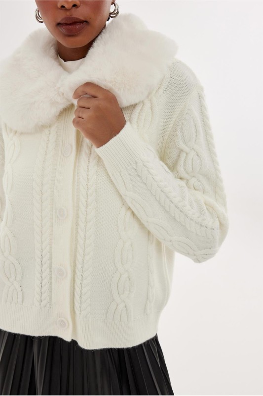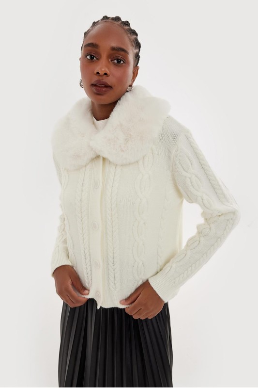 Yaka Kürk Detaylı Triko Hırka Ekru