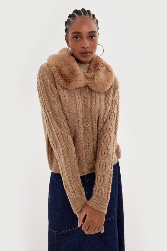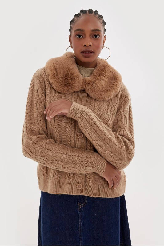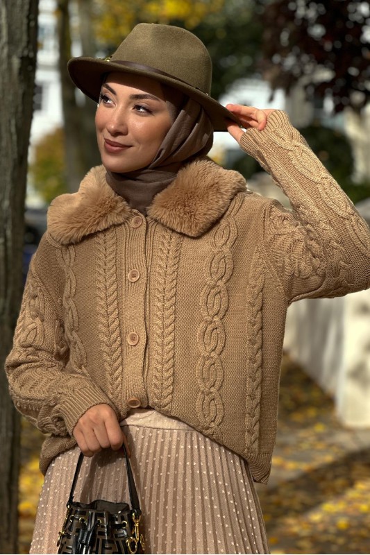 Yaka Kürk Detaylı Triko Hırka Kahve