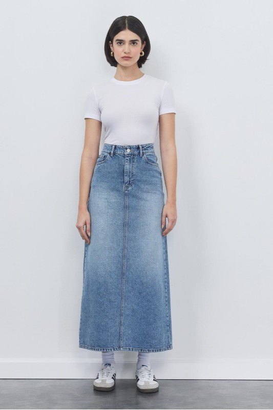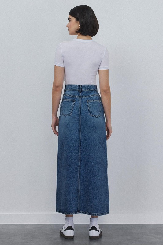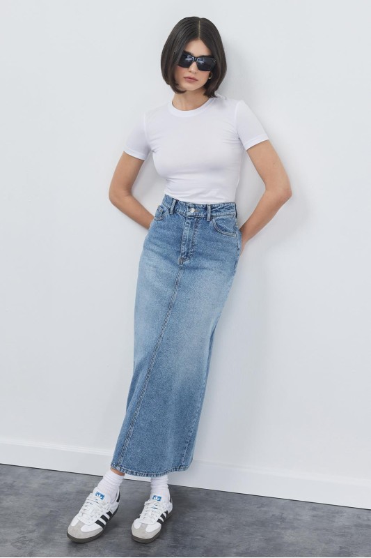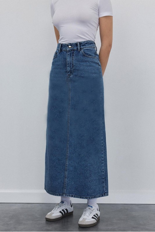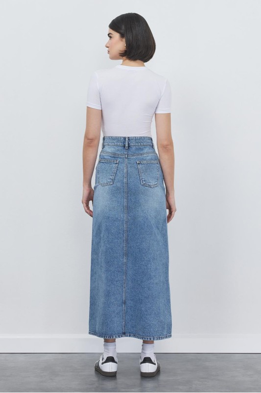 Yıkamalı Denim Kalem Etek Orta Mavi