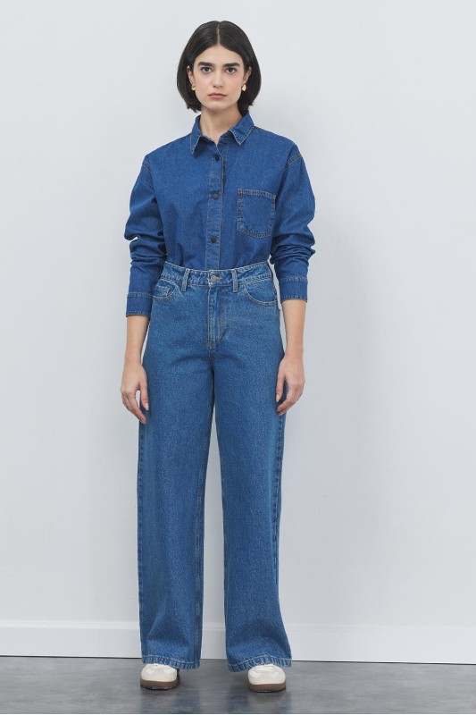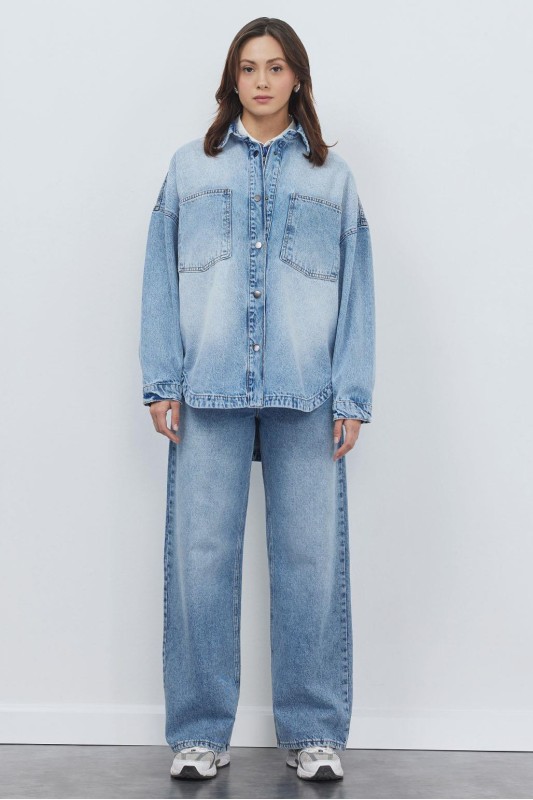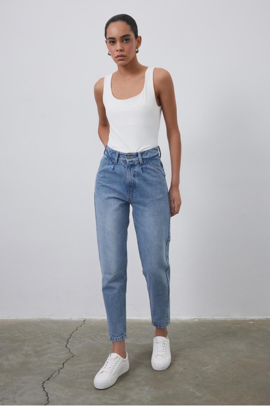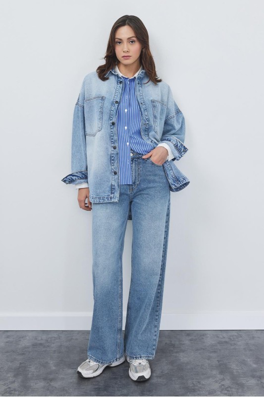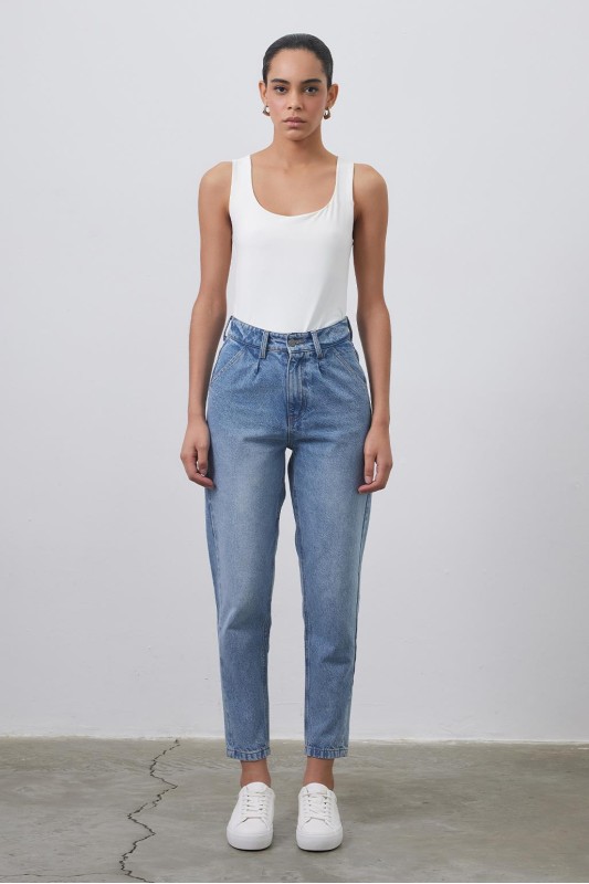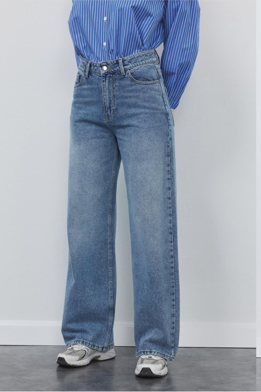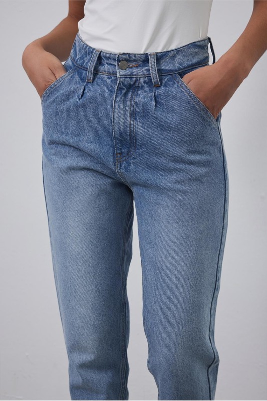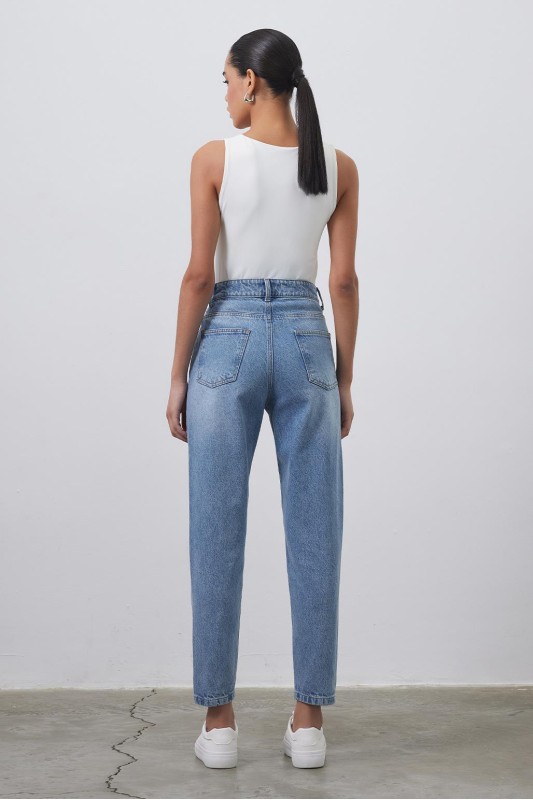 Yıkamalı Düz Kesim Yüksek Bel Denim Pantolon Açık Mavi