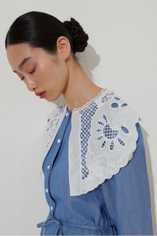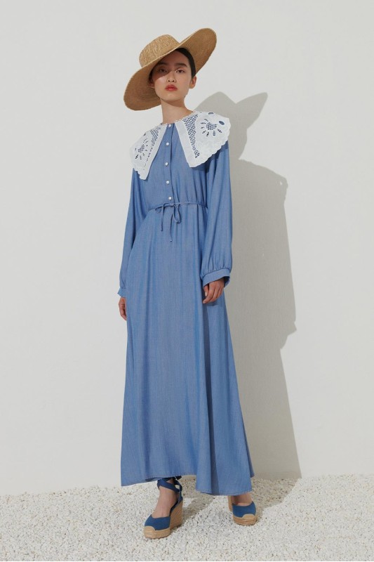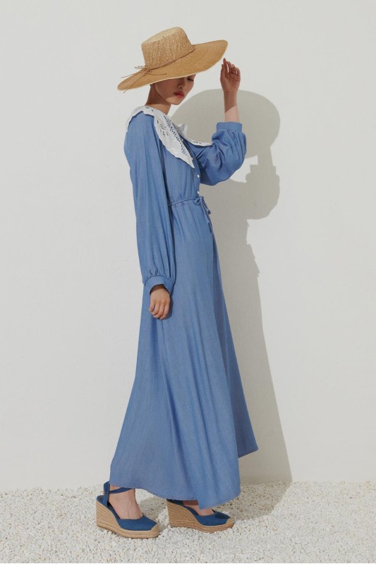 Dantel Yakalı Tencel Elbise Açık Mavi