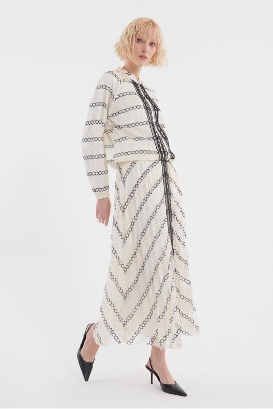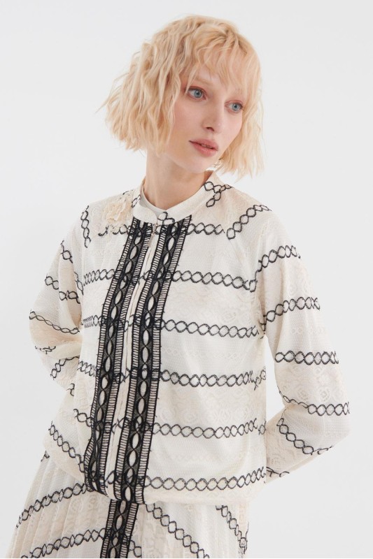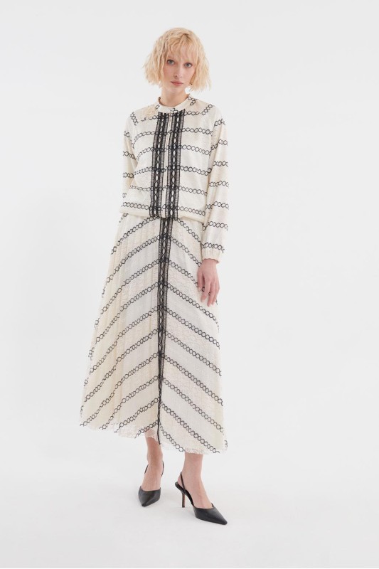 Dantel Bloklu Bomber Pilise Etek Takım Ekru