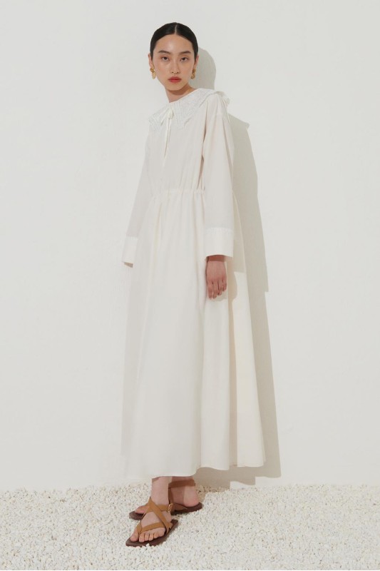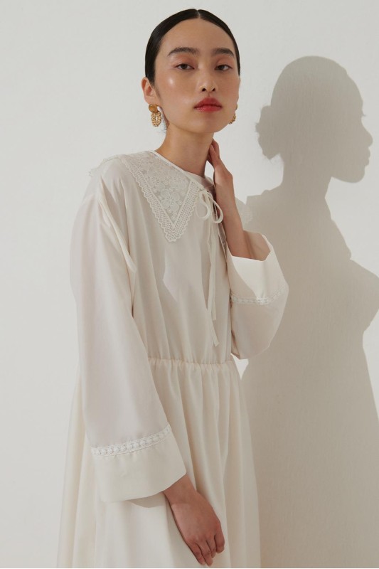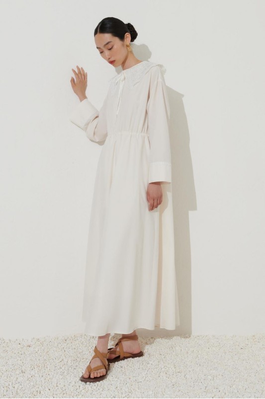 Dantel Yakalı Fistolu Elbise Ekru