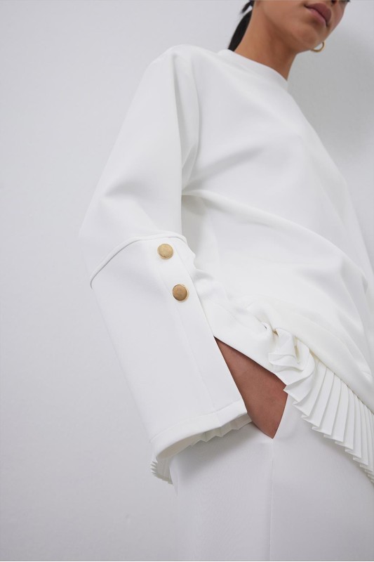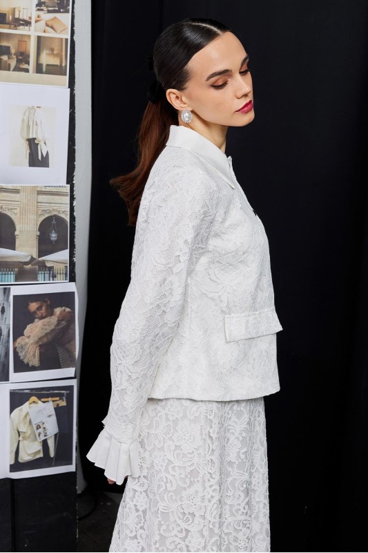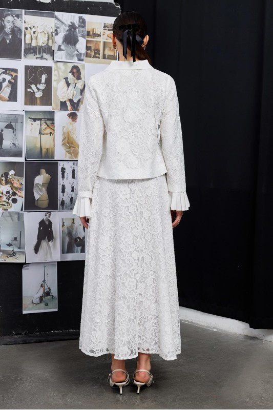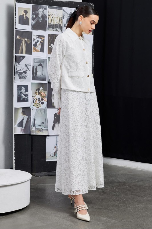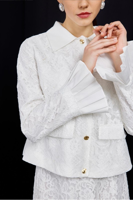 Dantel Pilise Kol Detaylı Ceket Çan Etek Takım Ekru