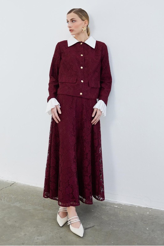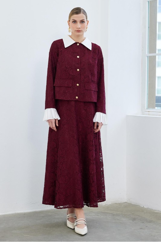 Dantel Pilise Kol Detaylı Ceket Çan Etek Takım Bordo