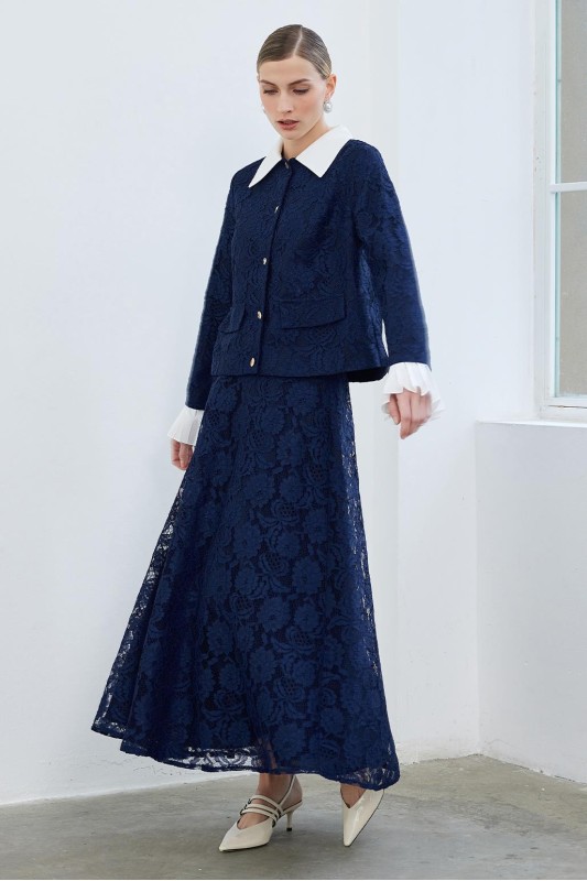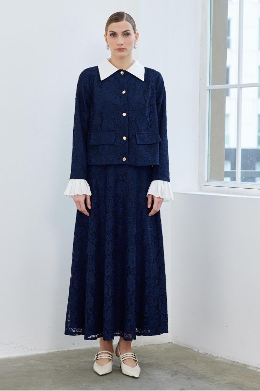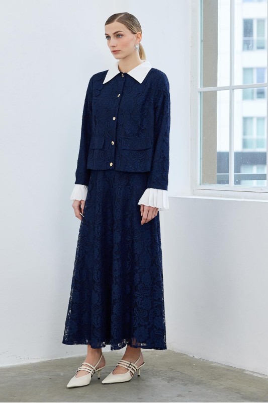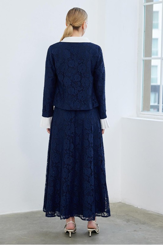 Dantel Pilise Kol Detaylı Ceket Çan Etek Takım Lacivert